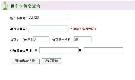 用戶只需將卡號(hào)與身份證號(hào)碼的最后六位輸入查詢系統(tǒng)中,就可以查詢余額和借還車記錄,如用戶沒有及時(shí)查詢余額,我們將會(huì)在余額低于20元時(shí)電話通知用戶。
